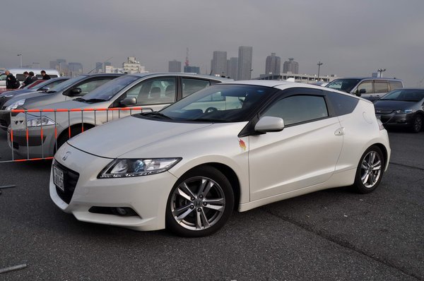 Ahogy caplatunk a bejárat felé, sorra látunk olyan autókat, amelyeknek a fenekén szinte még ott a koncepció-tojáshéj. Már a buszból szpottoltunk egy Nissan Leafet, de itt van még kettő, nem túl messze egymástól. A bejárat előtt kicsivel pedig ráakadunk az első Honda CR-Z-re is – élőben, pláne ebben a modern, felhőkarcolós környezetben igazán zsír.