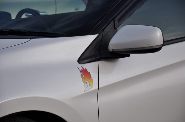 És felfedezzük rajta a CRX-nördök kedvenc jelét, a lángsörényű unikornist is. Ajjaj, ez az első, amit látunk belőle forgalomban, és máris...? Mindenesetre állat jól néz ki, ha nem tudnám, hogy egy piszkált Insight van benne, kéne is. Így csak egy jó tuning jut eszembe: kivenni a VTEC 150 lovast egy rozsdás CRX-ből, betenni ebbe...