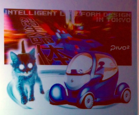 Mire elhatalmasodott volna rajtam a rosszkedv, szerencsére találtam egy lenyűgöző részletet a Nissan Pivo villanyautó koncepciójának fejlődését illusztráló dia jobb felső sarkában. (A Pivóban az az izgalmas, hogy 3 üléses, pont mint a McLaren F1, agymotorjai vannak, mind a 4 kerekét tudja kormányozni, ettől őrületesen fordulékony. A világ legegyszerűbb dolga egy 3 méteres, négykerék-kormányzásos üvegkabinnal parkolni, de ez sose fog kiderülni, mert a Pivo ezt megoldja saját maga.) Szóval a fantasztikus részlet a pszichedelikus robotizált kölyökmacska mint ihlető. Cuki, fordulékony és magától parkol. Alapvetően értem az összefüggést. Akármi is lesz az autózás jövője, Japán nem szűnik lenyűgözni.