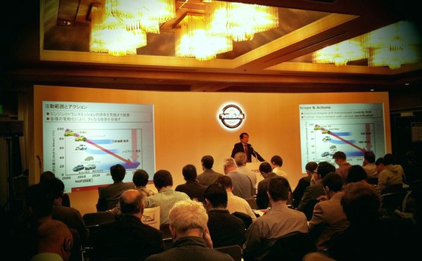 A téma egyébként a Nissan környezettudatos jövőképe, a Zöld Program - ehhez egyébként fényesen passzol a szűnni nem akaró orrtúrás - alliance platform synergies blablabla, a lényeg az, hogy az olaj ára örökre felfele tart, ezért le kell törni a fogyasztást, illetve jönnek a hibridek és a villanyautók, amikben a Nissan a Leaffel egyelőre magasan vezet. Húszezer felett adtak el, így lényegében napi egymillió kilométer tapasztalatuk gyűlik. Tök érdekes, hogy milyen messzire előre kell tervezni, például az akksik visszagyűjtésének, felújításának és újraértékesítésének a rendszere is feltalálandó.