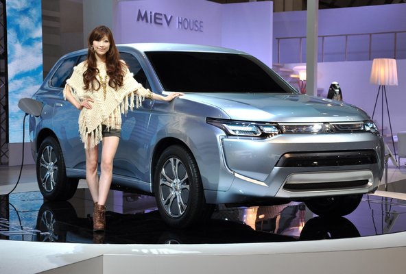 Nézzék csak, itt a Mitsubishi PX-MiEV, a mellette álló hosztesz gúnyáját talán egyenesen az álomkórszürke fényezéshez igazították. De lehet, hogy csak súlyosan másnapos volt a sztájliszt, bármi megeshet. A kis szívem szottya bocsánatkérőn álldogál az arctalan SUV oldalánál, tudja szegény ő is, hogy normálisan ennél a levelekért is elegánsabban megy le a postaládához.