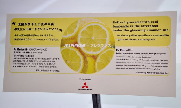 Ezt sejtették a Mitsubishinél is, ezért a Mirage-t megpróbálták feldobni egy olyan fogással, ami Európában korántsem mondható forradalminak. Hiszen a PSA már évek óta alkalmazza tudatosan, ha pedig visszagondolunk a Zsigulik szagára, pláne meg a Trabantok belsejét körüllengő ájerre, büszkén húzhatjuk ki magunkat – a keleti blokkban az autóbelsők szagtervezése már ősi hagyomány. Mitsubishiék illatosították ugyanis az autót, méghozzá citromszagúvá. Sőt, az egész stand körül olyan szellő lengedezett, mintha citromfa-ligetben járnánk. A világot már-már a sarkaiból kifordítóan ötletes fogás mögött komoly kutatómunka rejlik, a Mitsubishi és a Kanebo nevű kozmetikai-vegyiipari óriás karöltve dolgozott rajta. Hát, nem tudom...