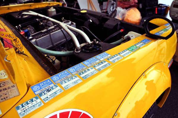 Még a futam előtt, merő véletlenségből pont engem szólított meg két japán csaj a parkolóban, ahol az oldtimer-versenyautók sorakoztak. Gondolom, gyakorolni akarták az angoljukat. Épp a Tomei alkatrészes cég standjától érkeztem oda, szép, sárga volt az autó, szép, sárgában volt a csapat, jól néztek ki, elkezdtem őket fotózni.