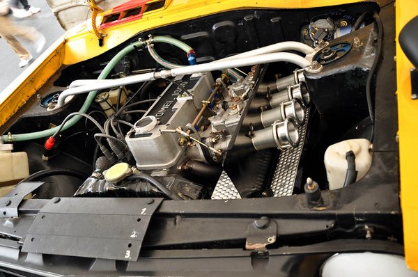 Ami viszont hatalmas, az a több körös, ágas-bogas olajszivattyú a motorblokk oldalán. Na meg persze a karburátorok sem kicsik – ha jól értem, 45-ös iker-Weberek, természetesen művészi tűtékkel, hőpajzzsal a nyakuk körül. Érdemes meghallgatni a második videón, amit találtam, hogyan szól ez a felépítését tekintve ódon, nagy fordulatszámra, versenyzésre teljességgel alkalmatlan, nyomórudas motor. Mint valami többhengeres, kétütemű versenymotor. Mechanikája simán purrog, a hangja izgalmasan recsegős, visszahörgős, a legjobb olasz sportgépeket juttatja az ember eszébe.
