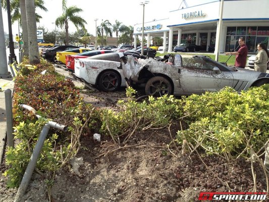 A miami Tropical Chevrolet nevű kereskedés előtt sorban kiállított Corvette Grand Sportokat a főútról érte a becsapódás. A szélen álló kapta a legnagyobb ütést, majd az autók sorban adták át egymásnak az ütközés erejét, így a sorban a harmadiknál lett vége a károkozásnak.