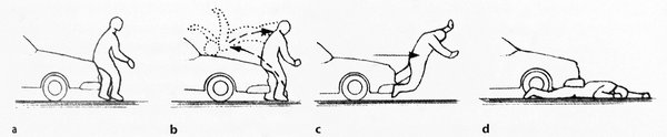 Sokkal gyérebb a kép a gázolásos baleseteknél. Kiterjedt horzsolások, diffúz lágyrész-zúzódások, kevés vér, sufficiens anatómia. Semmi izgalom. A gázolás általában alattomosan öl. A jellegtelen látlelet mögött sokszor durva szervi deformációk, gyors lefolyású károsodások húzódnak meg. Mindezt szemléletesebben jelzi, hogy a lépkapu beszakadásából húsz-huszonöt perc alatt el lehet vérezni, és szerencsétlen esetben akár 5-6 km/h-s rágurulással is létrejöhet a sérülés. Hasonlóan nagy károkkal jár a májrepedés, egy-egy leszakadt vese, esetleg a heveny szívizomzúzódás – mindegyik közös jellemzője, hogy a sértetten annak ellenére sincsenek riasztó nyomok, hogy egyáltalán nincs jól.