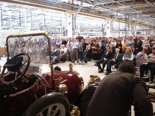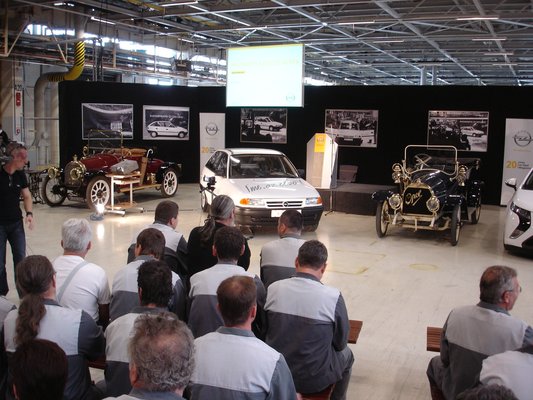 Bent a csarnokban egy csinos mini múzeumot húzott fel az Opel sajtóosztálya, merthogy ugye nem csak a magyar Astra lett húsz éves, hanem az Opel márka is 150. Ezt az évfordulót egy Opel varrógép és egy sárga Opel versenykerékpár testesítette meg. Aztán van százéves magyar vonatkozása is az Opel történelemnek, hiszen két gyönyörű Opel veterán, a tavaly százéves Torpedo és az idén százéves Puppchen magyar tulajdonban van. A két autó, amely tavaly a mi Csikósunkkal a fedélzetén saját erőből ment haza Budapestről a német anyagyárba, szintén ott sorakozott a színpad előtt, közrefogva a húszéves első magyar Astrát, amelyik ugye saját kerekein jött ide. A jelent pedig a két hete Év Autója díjat nyert és tavasszal a magyar piacon is bemutatkozó elektromos autó, az Opel Ampera testesítette meg.