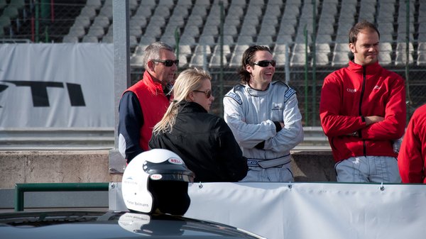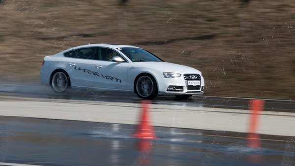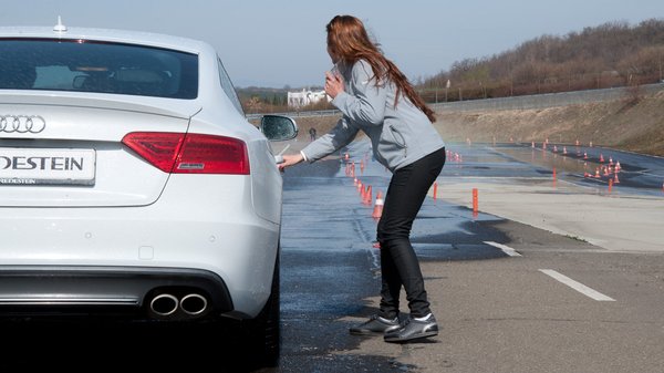Ügyesen rakták össze a programot a szervezők: a hátsókerekes tulkot a száraz pályára tették, az összkerekes Audival pedig a vizes tapadást demonstrálták. Az S5-ös könnyebben kezelhetőnek bizonyult, csak a fellocsolt aszfalton még szűkebbre húzták a bójákat, így nehéz lett volna feszegetni a határokat az engedélyezett egy perc alatt. Mókának jó volt, ropogott az ABS meg az ESP, az Audi nem vallott szégyent. De ahogy az instruktorok végigfűzték a pályán az S5-öst, azt nehéz lett volna megismételni, minden elismerésem. Álldogáltunk is a pálya mellett, mint a kerti törpék, amikor a vredesteines fickó elvitte az egyik kísérőleányzót egy próbakörre.