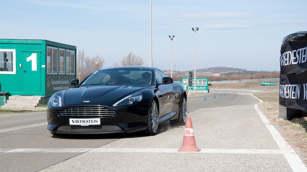 Kábé nettó egy perc jutott minden seggnek az Aston finoman varrott ülésében, hogy megérezze a luxus tapintását, a kezeknek pedig egy nyomás az automata váltó D gombján és némi gyakorlatozás az Ikarus-méretű kormánnyal a szűken rakott bóják között. A szlalomozás szinte minden ismeretlen autóval bénázásba fullad, még ha száraz is a pálya, de a Virage meglepett az elsőre elég ügyetlennek tűnő kormányzásával. A viszonylag nagy ívekben is fél fordulatot kellett tekerni rajta, és nagyjából egy döglött angolna markolászására emlékeztetett a volán. Nyilván nem illik lefikázni egy Astont ötszáz méter és nyolc kanyar után, de az első benyomások nem döngöltek földbe.