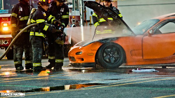Mindez önmagában talán nem volna különleges – a világ jobbik felén tucatszám találni hasonló autókat – de egy tavaszi gumiégetős bravúroskodás során sikerült lekapni, ahogy a Mazda kupé lángra kap. A problémát állítólag a kábelezés szigetelése okozta, amely a hideg időben merevvé vált, majd a motor nagy hője hatására megolvadt. A zárlat ráadásul épp egy benzincső alatt következett be – a szemtanúk szerint így egy pillanat alatt lángolni kezdett az autó.