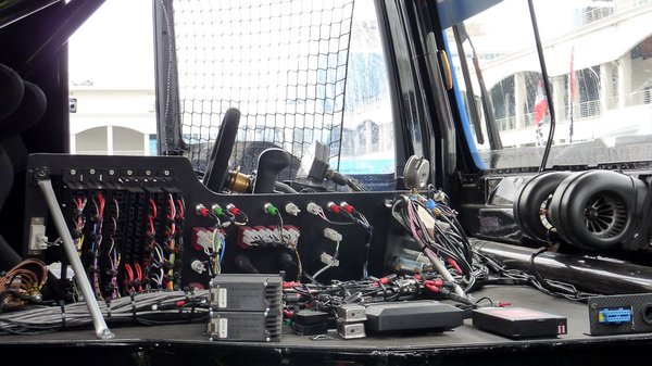 A versenykamion, legalábbis a Renault, kívülről vagány, belülről viszont nagyon rendezetlen. A biztosítéktábla könnyedén lerúgható a lábam előtt (mivel alapvetően _nem_ utasszállításra tervezték), a kijelzők, kapcsolók és kábelek spontán módon tekergőznek a fél magyar rali-bajnoki mezőny megtartására méretezett bukócsövek között, a pilóta és az utas kagylóülését pedig rettentő méretű púp választja el. Ilyen biztos nincs az igazi kamionban.
