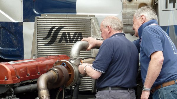 A púp alatt csak a szél jár, a motor nem itt van, hanem a csőváz köré felszerelt fülke mögött, a súlyelosztás szempontjából tökéletes helyen, ahol ráadásul könnyű is szerelni. Például, amikor egy nem gyári támogatással induló csapat kamionján megbomlott a kapcsolat a gigantikus turbó és a töltőlevegő-hűtő csöve közt, hirtelen két ősz hajú bácsi mászott be a valódi funkciót be nem töltő oldalborítás mögé, hogy ott pillanatok alatt helyreállítsa a hibát egy csavar meghúzásával. Ehhez egy sertésszállítmánnyal lerobbant közúti példányon biztosan előre kellett volna billenteni a fülkét. Akkor viszont a versenyzőnek is ki kellett volna szállnia, az meg olyan snassz.