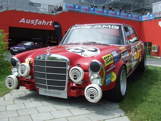 Kint, az épületek előtt az egyik nagy kedvencembe botlottam, a versenyautók nyakkendős prolijába: az AMG 6.8-asba. Bár ez a kiállított darab a régi versenyautónak csak replikája, iszonyú jó látni élőben ezt a dögöt. A Mercedes egyik legelegánsabb autójából, a W109-ből csináltak versenyautót, ez volt a legelső AMG modell. Finomságról, eleganciáról azonban nehéz beszélni, mikor akkora kereket csavaroztak a látványosan kiszélesített kasztni alá, amiknek az alapanyagából egyenként ki lehetet volna hozni egy korabeli családi autó összes felnijét és gumiját. A nagy vényolcasról is inkább a kissé tufa amerikai autók jutnak az ember eszébe, nem a finom európai versenygépek. Kicsit olyan, mint Schwarzenegger szmokingban.