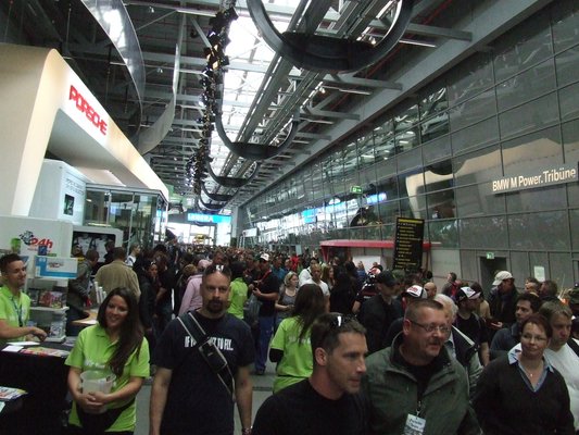 Őrületes létesítmény-komplexumot húztak fel a pálya mellé, modern, színes, szagos, mindent tud. Kétszer két sávos út, körforgalmak, gyalogos felüljárók, mélygarázsok, mindenfelé pofaleszakajtó autók és motorok. Ez az, amivel az ember először szembesül. Aztán jönnek a finomságok. A carrerás rendezvény az egyik új épületben, a Ring boulevardon zajlott. Itt egy nagy placcon elfért egymás mellett az AMG standja, az Audi által kiállított autók, a Carrera versenypályája a lelátókkal, a Playstation kamion, meg a szimulátor-R8, a Gazoo Racing visszafogott standja, a Bild-csoport sátra, ahol egész nap könyörögtek az embereknek, nyerjenek már egy vadonatúj mobilt, mert hegyekben állt a hostessek mögött. Ja, volt még három vagy négy büfé sörpadokkal, asztalokkal.