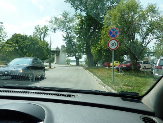 Állunk több mint egy évvel a történtek után Esztergomban a Nagy Duna-sétányon Gáborral. Mögöttünk a Szalma Csárda táblája, balra a kompkikötő, vagyis nagyjából a rendőrautó egykori helyét tapossuk. Előttünk autók suhannak el. Lassan követik egymást, most valóban kint van a tábla a hídpillér mögött, bár kétségtelen, hogy nem látni a csárda bejáratától. Nem tudtam olyan képet készíteni önöknek, amelyen akárcsak be lehet karikázni a harmincas táblát abból a szögből, ahol a rendőrök álltak egy éve, március másodikán, reggel.
