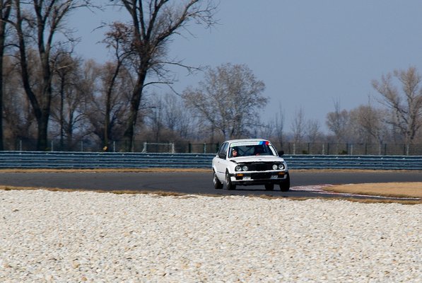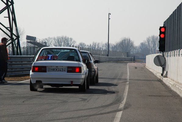Volt egy garnitúra felnire szerelt slick gumim a pincében, amit akciósan szereztem, de mivel még soha nem voltam pályán, nem mertem felrakni, ne én legyek a bazári majom, aki beül a csöves autóba, felteszi a slick-et, aztán ő a mobil lassító a pályán. Volt egy garnitúra új utcai Debicám, gyári felniken, majd azokkal megpróbálom. Az autó alatt gyári rugók voltak, vastagszáras Bilstein gátlókkal, gyári alapbeállításokkal, hóban ez teljesen jó, meglátjuk, mire elég mindez a pályán.