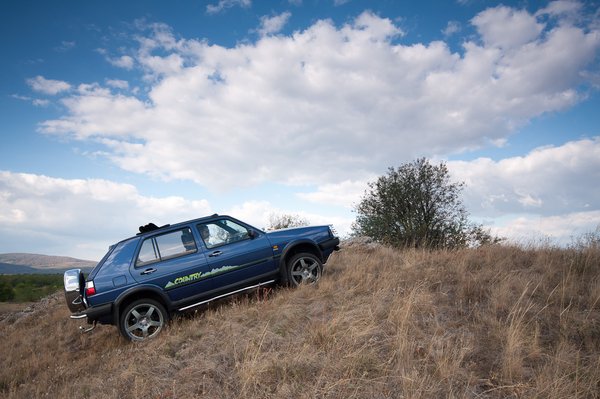 És hogy milyen egy Golf Country? Érződik rajta, hogy nem a véletlen műve, hanem egy átgondolt koncepció része, és nem csoda, hogy háromszor annyiba került, mint egy korabeli Golf. Árpád utcai gumis, malomkerekes autója gond nélkül felkapaszkodott a füves lejtőn, sőt, oda-vissza tolathattunk, kedvünkre közlekedhettünk olyan dzsindzsában, amelybe egy mai SUV-val is éppen vállalható még.
