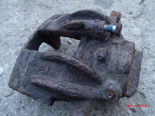 Szétszedtük a féket, beigazolódtak a sejtéseim, a féknyergek levelesre rohadtak a fékbetét lapján keresztbe volt repedve, és csak azért volt a helyén, mert a berohadt dugattyú folyamatosan a tárcsának nyomta a betétet, így az állandó feszítés miatt nem tudott kiesni. A féktárcsák meglepetésre viszont teljesen jó állapotban voltak.
