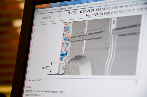 Megjelennek a rajzok a monitoron, és még jobban csodálkozom, miért nem használják mások ezt az őrületes információbombát. A kárpitpatentok elhelyezésétől a varrattömítő paszta típusáig minden pontosan le van írva, amit tudni kell a gyárival egyenértékű javításhoz. A srácoknak a műhelyben persze nem kell minden lépést kipuskázniuk, ha nem ismeretlen a típus. De mindig jól jön a gyári támogatás, hogy pontosan hol kell levágni azt az oszlopot, milyen árammal kell hegeszteni, milyen sorrendben érdemes dolgozni.