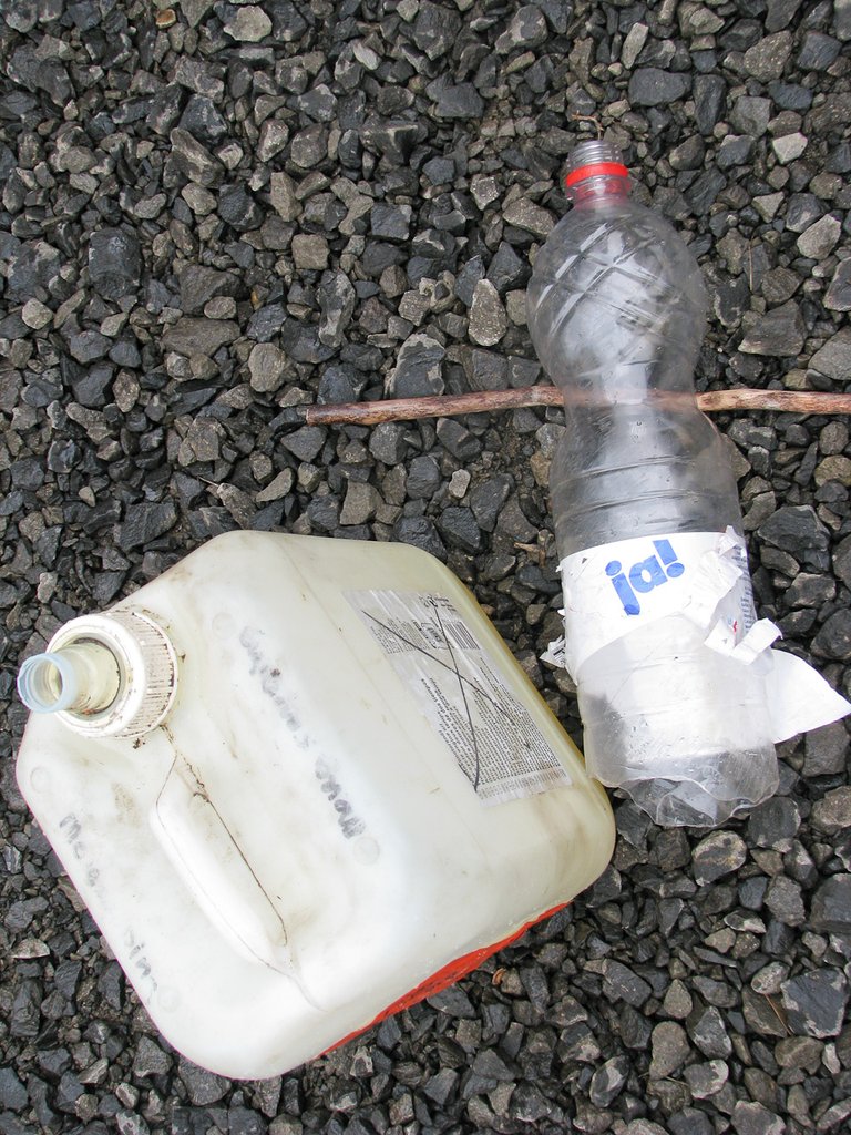 Kellene egy kés. Kérdem a kamionosomat, van-e kése. Neki az sincs, és magára is zárja a kamiont. Ja, kamionos kés nélkül. Micsoda egy aranybogár, biztos Teréz anya egyenes ági leszármazottja. Le vagy szarva, megoldom. Találtam egy repedést a palackon, és a repedés mentén le tudtam szakítani kézzel a palack alját. A külsejét lemostam, a belsejéből a zöld lét kimostam ásványvízzel, a vizet meg kitöröltem egy használt alsónadrággal.