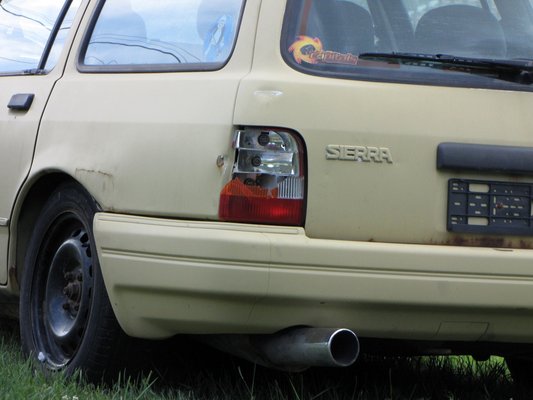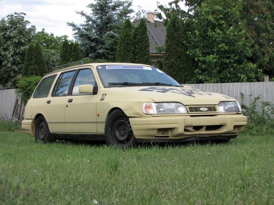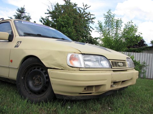 A hidegben teljesen rideggé vált hátsó lököst telehányták a kerekek vizes hóval, amitől természetesen az darabokra tört. Valamelyest gatyába lehetett rázni, de sajnos az első lökhárítót agresszív hófalak támadták meg, kezdett egyre vállalhatatlanabbul kinézni a kocsi. Illetve ez így marhaság, egyszerűen aránytalanul sok gyorskötöző és kacsaszalag kellett az egyben tartásához. Ezért kapott egy bontott hátsó lököst (akinek van Sierra kombihoz való, akár sérült lökhárítója, ne fogja vissza magát, kell a tartalék alkatrész), meg a 2,9-es motor donorjául szolgáló háromajtósnak a polcon pihenő első ütközőjét is feltettem.