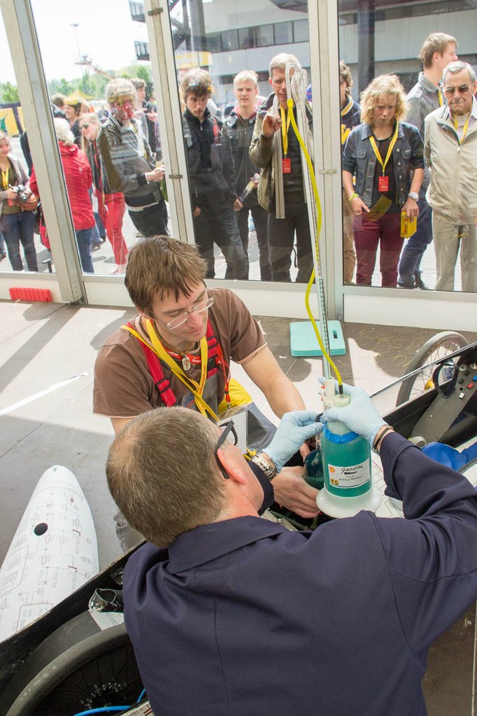 A fogyasztást benzineseknél egy sima skálázott pipettával mérik, elektromosoknál joule-mérővel, míg a hidrogént kalibrált átfolyásmérő tartja számon. Ezek állását a rajt előtt és cél után ellenőrzik, a különbséget még pár tényezővel teszik még pontosabbá. Hőmérsékleteket is rögzítenek, így az üzemanyagok hőtágulása sem csaphatja be a rutinos szervezőgárdát. Az egész csapat vérprofi volt, ránézésre tudnak kapcsolási rajzot képzelni mindenféle résztvevő kocsiról.