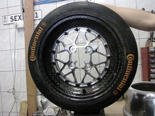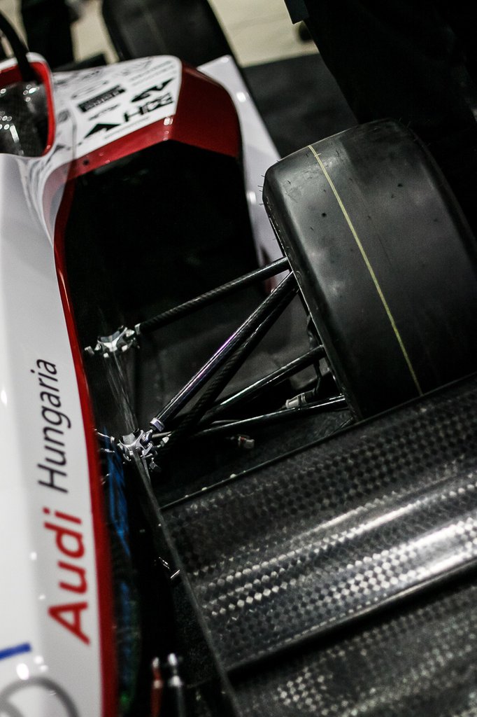 Innentől előre mindennek az alapja a monocoque váz, ehhez erősítik a futóművet, az akkumulátordobozokat, mindent. Ez a kompakt szénszálas héj történelmi jelentőséggel is bír: ez az ország legelső, teljes mértékben itthon tervezett, fejlesztett és kompozit anyagokból gyártott monocoque-ja. Ezzel a megoldással csak a vázon spóroltak 10 kilogrammot, aztán nekiálltak, szénszálas merevítésű anyagból legyártották a felnik ráfját is, amikhez a gyönyörűen mart felniközepeket csavarokkal rögzítik. Ezekkel is megfogtak összesen tíz kilót, ráadásul ezt a rugózatlan tömegek rubrikájából lehetett kihúzni.