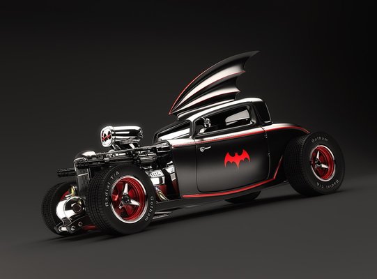 A téma persze a rajongókat is megihlette, akik olykor borzalmas replikákkal jelentkeznek, most azonban egyikük hot rodot tervezett Batmannek. Az autó fekete fényezését vörös csíkok díszítik, és a felniket is ehhez igazította a készítő. A tetőn denevérszárny jelzi, hogy kinek az autójával van dolgunk, míg az orr-rész két oldalán gépfegyvernek látszó tárgyakat látunk – ez utóbbi kissé sántít, hiszen a denevérember nem használ lőfegyvereket.