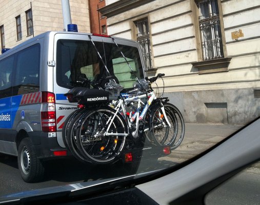 Frissítés: Olvasónk, Péter küldött nekünk két fotót, amit tavasszal készített a Róbert Károly körúton. Reméljük, mivel szemmel láthatóan a rendőrségnél is felfedezték a vonóhorgos kerékpárszállítás előnyeit, kellő nyomást tudnak majd gyakorolni a jogalkotókra.