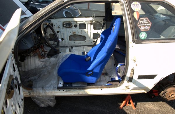 A meseszép és kényelmes Subaru-ülésekről, amiket kábé egy egész napos munkával faragtam be az AE86-osba, kiderült, hogy túl magasak. Sejtettük persze már a próbaülések alkalmával, de a padlólemeznél mélyebbre csavarozni nem lehetett volna őket, és mivel ezek voltak kéznél, felhasználtuk őket. A pályanapon viszont egyértelművé vált, hogy még sisak nélkül is csak görnyedve tudjuk vezetni a gépet, ami tarthatatlan. Bukót és normális üléspozíciót akartunk, de ízibe.