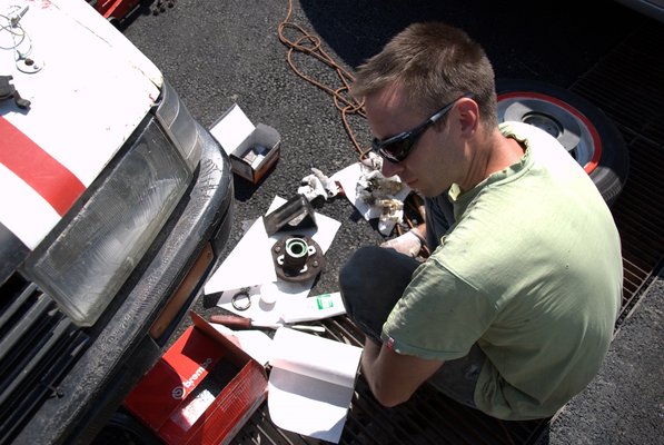 Alkatrészkupacunkat néhány liter váltóba és sperrdiffibe való olajjal tettük teljessé, mivel az évek óta álló hajtáslánc üzemmelegen meglehetősen éles hangon kezdett énekelni. Bár Karotta megnyugtatott, hogy ez a Hacsinál teljesen normális, azért nem tűnt rossz ötletnek, ha az állásban nyilván korrodálódott felületekről lemosott koszt leengedjük az első olajtöltettel. Mellesleg sikerült a gyári speckóknak maradéktalanul megfelelő olajat szereznünk, úgyhogy muszáj volt ezt betölteni.