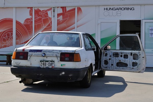 Amint megérkezett a versenyautó a Hungaroringre, a lemenő nap sárgás fényében világossá vált, hogy reménytelenül túlkormányzott lett a gondosan méretre vágott combos hátsó rugókkal. Nem csak a lengéscsillapítás hiánya, hanem egyszerűen a rugóállandók aránya miatt is. Civil tempónál egy határozott kormánymozdulatra már keresztbe is vágta magát, ami még jól jöhet egy másik jellegű bevetésen, de pályaautózásra tökéletesen alkalmatlannak tűnt.