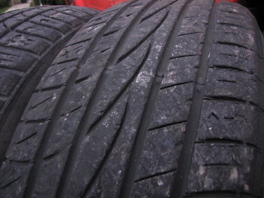 Tibi még akkor is szitkozódott, mikor a gondosan nejlonba csomagolt gumikat bedobáltuk a kocsimba, úgy utálta ezeket a gumikat. Zajosak voltak, ráadásul egyszer nyolcvanas tempónál felúsztak a vizes országúton. Nem volt sok a víz, forszírozott a tempó, mégis majdnem tönkretették a Papp család kirándulását. Jobban megnézve látszik, hogy konstrukciós baromság miatt képtelen az abroncs elvezetni az alá került vizet: a lamellákat összekötő hosszirányú anyaghidak bizonyos kopási szint után (még nagyjából 6 mm volt a gumikon!) teljesen elbarikádozzák a kifelé áramló víz útját. Nem is értem, hogy gondolták. Mindenesetre száraz aszfaltra biztos jó lesz, csak jobb lehet, mit az ősöreg Firestone Fuel Saver.