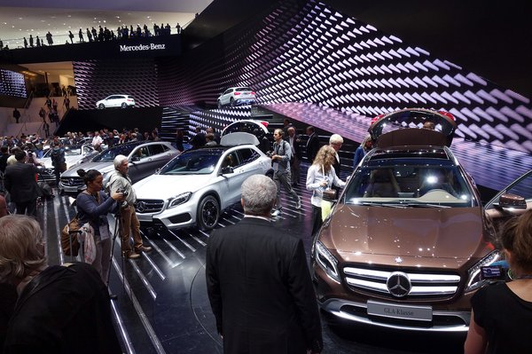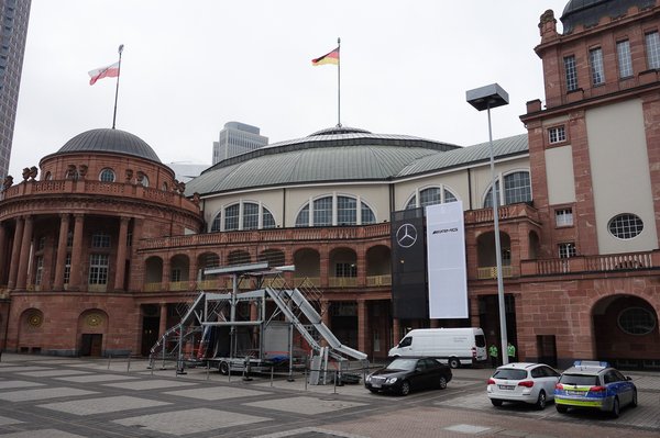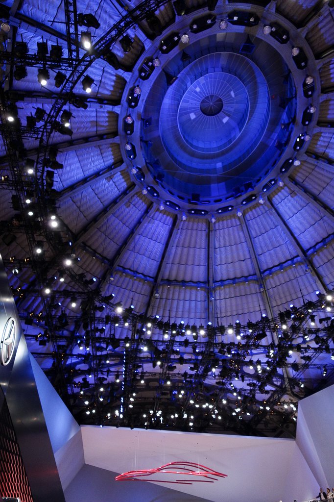 Építhet mindenki könnyűszerkezetes csodákat, rendezhet be dzsungelt valamelyik hatalmas kockapavilonban, de míves, régi, kupolás téglaépülete egyetlen cégnek van csak a frankfurti szalonon – a Mercedesnek. Áhítat van is odabent rendesen, nem kell hozzá autókat nézegetni, elég bemenni az egész kóceráj közepébe és felnézni. Mint valami még meg nem született sci-fi-egyház jövőbeli templomában, olyan az egész.