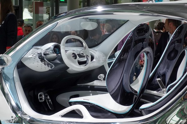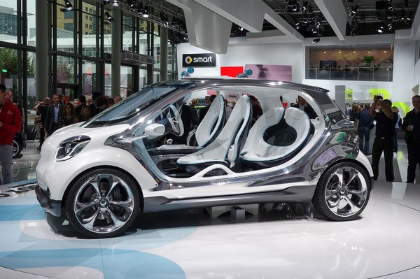 Oldala nincs, teteje is alig, tiszta műanyag az egész, olyan, mint valami hetvenes évek eleji penthouse-enteriőr, csak a narancs és a piros színek fakultak ki a retro-fotóból bő negyven év alatt. A prototípust 75 lóerős villanymotor hajtja, s valami hasonló viszi majd a végleges verziót is, igen, azt, amelyiket a Renault gyárt majd a Smart számára. Talán ezért nincs oldala a Smart-tanulmánynak – súgok, Twizy?