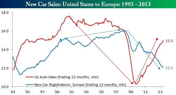 – 2008-tól Európában drasztikusan csökkennek az autóeladások. A tendencia folyamatos és nyugalomra egyáltalán nem ad okot. Az Európai Autógyártók Szövetségének brüsszeli jelentése szerint az idei év (2013) eladásai abszolút mélyponton vannak, 1990-es szintre estek vissza. Áprilisban 1,7, illetve júliusban 5 százalékos növekedés volt ugyan tapasztalható, ennek ellenére a többi hónapban zuhantak az eladások. Az év első nyolc hónapjában 7 841 596 gépjárművet adtak el, ez a 23 évvel ezelőtti szint. Harald Hendriksen, a londoni Nomura International elemzője szerint a jó hír az, hogy a piac elérte a mélypontot. Sokkal rosszabb viszont, hogy úgy tűnik, innen nem mozdul.
