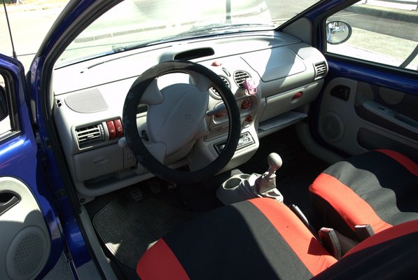 Bamugartner-matrica és utólagos gumicsík az ajtókon. Ott, ahol a legszélesebb az autó, nem ott, ahová gyárilag rakták. Mondjuk ez nem baj. A vezetőülésen van egy csúnya szakadás, rajta egy olcsó, borzalmas üléshuzat, de ezt leszámítva a beltér szép, tiszta, nincs bagószag és összevissza karcolt műanyagok. Szerencsére nincs két egyforma Twingo, így mondjuk egy színhelyes szivargyújtó pótlása is macerás, ezt a bordót kihúzva látszik, hogy soha nem dohányoztak benne.