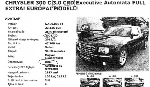 A Galgamácsán magánrendelőt üzemeltető Kovács úr három éve le akarta cserélni megszokott Audiját valami fiatalabbra. Kiválasztott egy 2008-as évjáratú Chrysler 300C 3.0 CRD-t, melyet kétévesen, kevesebb mint ötvenezer kilométerrel hirdetett egy üllői használtautó-kereskedés, az Auto House Kft. A kocsi bizományban volt a telepen, magyarországi forgalomba helyezésre várt. Kényelmes, hatalmas szedán, Mercedes-eredetű dízelmotorral és az összes rendelhető extrával. Mindenben megfelelőnek tűnt.