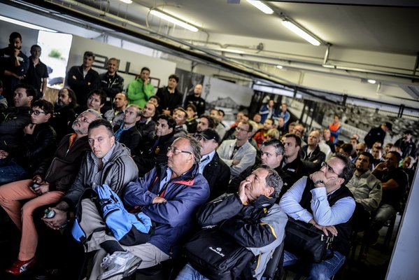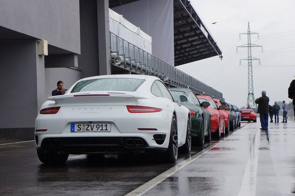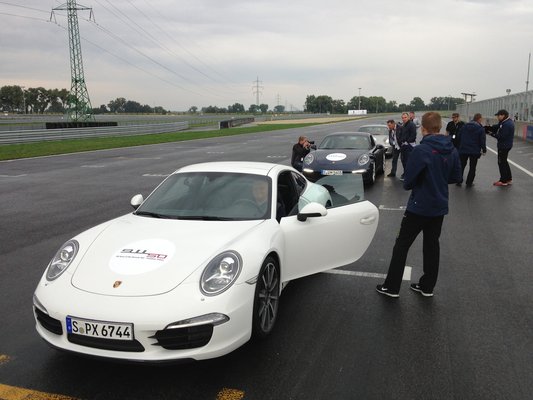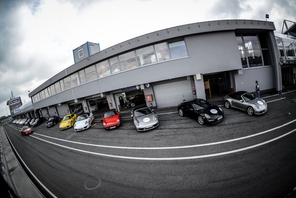 Összegyűlünk odabent, és elkezdődik az eligazítás. Nem először vagyok Porsche-eseményen, és mindig lenyűgöz, hogy mennyire rokonszenves vállalat, pont az ellenkezője, mint amilyennek az átlag Porsche-tulajdonost elképzeli az átlag irigye. Szakszerű és rendezett, de közben vidám és oldott, a frankómegmondás és az intelligensebb testnevelőhumor őszinte és szerethető elegye. Jan Kalmar, a dán vezető instruktor egyszerűen lenyűgöző, úgy mókás, hogy ösztönösen vigyázzba akar állni előtte az ember Mindjárt az elején keményen kezdünk: 50 éve készítjük a világ legjobb sportkocsiját. Azt, amihez mostanra minden mást mérnek. De a ti piacaitokon (Azerbajdzsán, Moldova, Kazahsztán, Fehéroroszország, Ukrajna, Magyarország, hogy csak a hangulatosabbakra térjek ki) nem innen ismernek minket, hanem a [kocsisort a szembesávban dudálva előző, levegőbe géppisztolyozó] Cayenne-ről és a [burgonya formájú, lézerblokkolóval pályabüntető] Panameráról. Márpedig a Porschét elsősorban a 911 határozza meg, a 911 a porscheség maga. Ezzel akarunk benneteket megismertetni ebben a két napban.