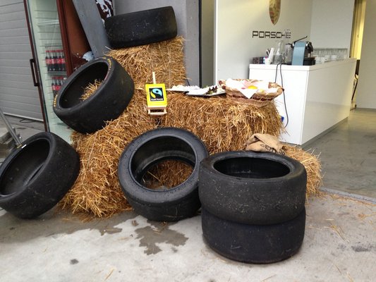 Eligazítóhelyiségnek pár egybenyitott box szolgál. A bejárat mellett az autóversenyzés halálromantikáját idéző szénabálákra hajigált versenygumik között vár ránk a friss gyümölcs, és a szigorúan fair trade és organic Nespresso.