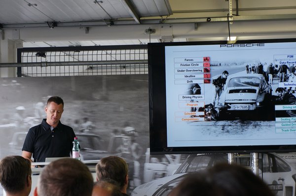 A driftről tartott eligazítás nagyszerű volt. Nem is csak azért, mert megpróbálták egész ügyesen összefoglalni elméletben, hogy mi a teendő annak érdekében, hogy hosszan faroljunk egy drága autóval (ami pedig gyerekes és felelőtlen dolog), hanem önmagában azért, mert volt ilyen program. A Porsche ezzel azt mondja, hogy igenis rendes, kemény, sportszerű és játékszerű használatra készíti az autóit, és nem bánja, ha ezt el is mondjuk másnak.