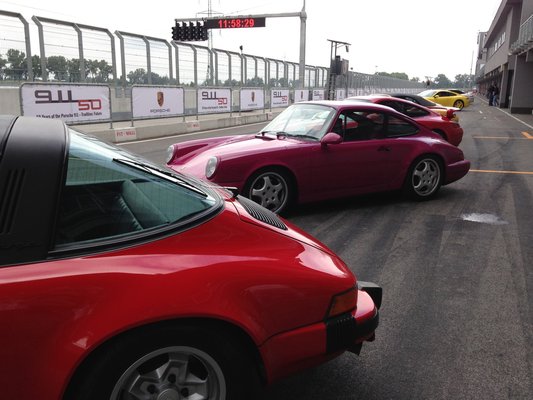 Bent archív versenyfelvételekből van az egész fal. Ez már a kiképzésünk része. A 911 karrierjét ugyanis nem elsősorban plasztikai sebészek és gránitarcú színművészek írták, hanem nagyrészt a versenypálya. A 911 egészen szürreális mennyiségű versenyen nyert, olyan távoli műfajokban is, mint a sivatagon átzúzás és a 24 órás pályaversenyzés. A világ legsikeresebb autója, ez nem kérdés. Mindennek csak részben az a statisztikai sajátosság az oka, hogy semmilyen másik sportautót sem hívnak 50 éve ugyanúgy. A fontosabbik tényező valószínűleg ugyanaz, ami a Lamborghinit is megszülte: a dac. Csak míg Ferruccio egy másik olaszt gyűlölt, a németek a fizikát, azon belül is elsősorban a centrifugális erő és a tömegközéppont sajátos összefüggéseit. Így lett a hátul hordott, hathengeres boxermotorból az autóipar leghíresebb szexepilje.
