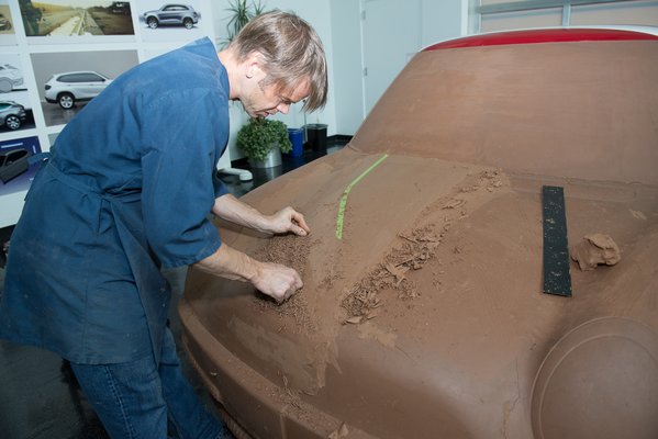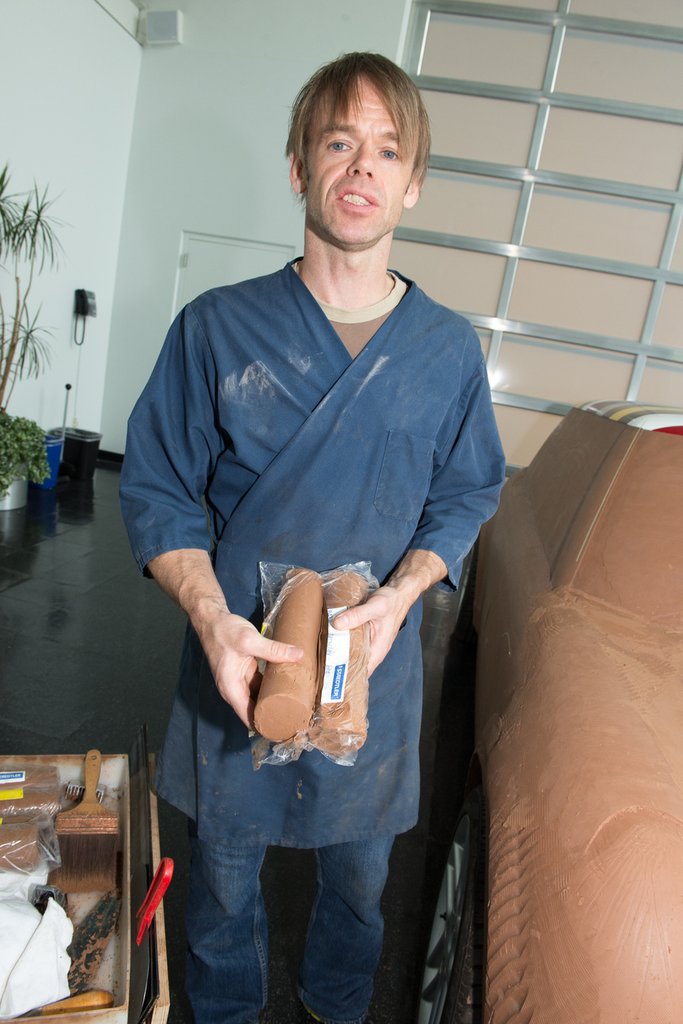 Először vannak a vázlatok, aztán azokból készül egy válogatás helyben, majd Münchenben. Itt még erősen eltúlzottak, tanulmányautósak a vonalak, de legalább a többiek jobban értik, mit akart a tervező. A legfontosabb vonalak kiválasztása után jutnak el a kétdimenziós modellig, és amikor az már elég tisztán megvan, jön Patrick Karlsson, a szobrász, aki legalább húsz éve vereti a szakmát. Két, bejglire emlékeztető barna rudat tart celofánban, és kedvesen felém nyújtja, ne lepődjek meg, mert meleg, de csak hatvanöt fok, nem kell félni. Megfogom, kellemesen truttyan az ujjaim között, és persze zsíros nyomot hagy, ezért is van a dizájnszobrász úgy öltözve, mint egy Lannister a Trónok harcából, aki épp a Starkoknál tölti életfogytiglani börtönbüntetését.