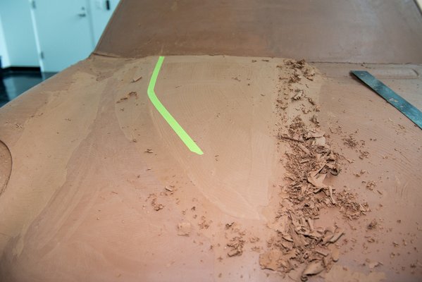 A szobrász közben olyan domborulatot épített, hogy a géptető jó pénzért mehetne is az Ebayre, Nick pedig megmutatja, hogy megy a tervezés a gyakorlatban. Letép egy darabot a festőszalagjából, és egy kicsit odébb ragasztja az agyagra, kanyar is van benne, Patrick pedig ütemtévesztés nélkül faragja tovább a kétkezes fémszerszámmal. El is képzelem, miket morognak magukban a szobrászok. Például mikor Bangle a 7-es faceliftjének faragását vezényelte, vajon felszisszent-e néha az illetékes Patrick? Most mindenesetre odébb kell faragnia a domborítást, az íve is nagyban változik, a fény is egészen másképp esik rá.