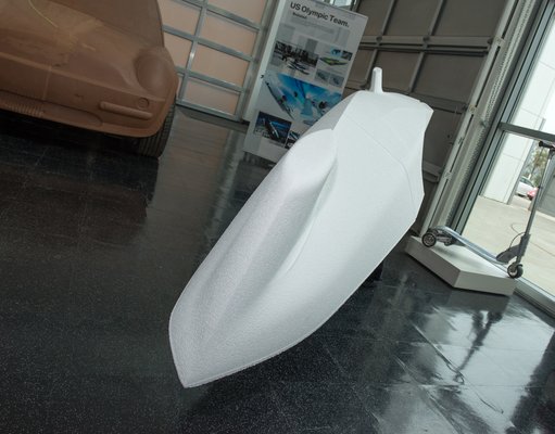 Na de fogkefe??? És a Robocop-stílusú számítógépes egér gamereknek? Tabletes kezelőfelület egy erőmű számára? És ez még semmi: itt az amerikai bobcsapat bobja, még ha csak a fele is, hungarocellből. A géppel mart tömbön festés sincs, de ha hihetünk Jackie-nek, Szocsiban BMW-emblémás bobbal csúszik az amerikai csapat. (Halványan egyébként ezen a linken az egyik képen kivehető a bob orrán a bajor propeller.) A dizájn a szponzoráció része: nem csak pénzt kapnak a sportolók, hanem a formatervezést is, ami megint nem kis tétel.