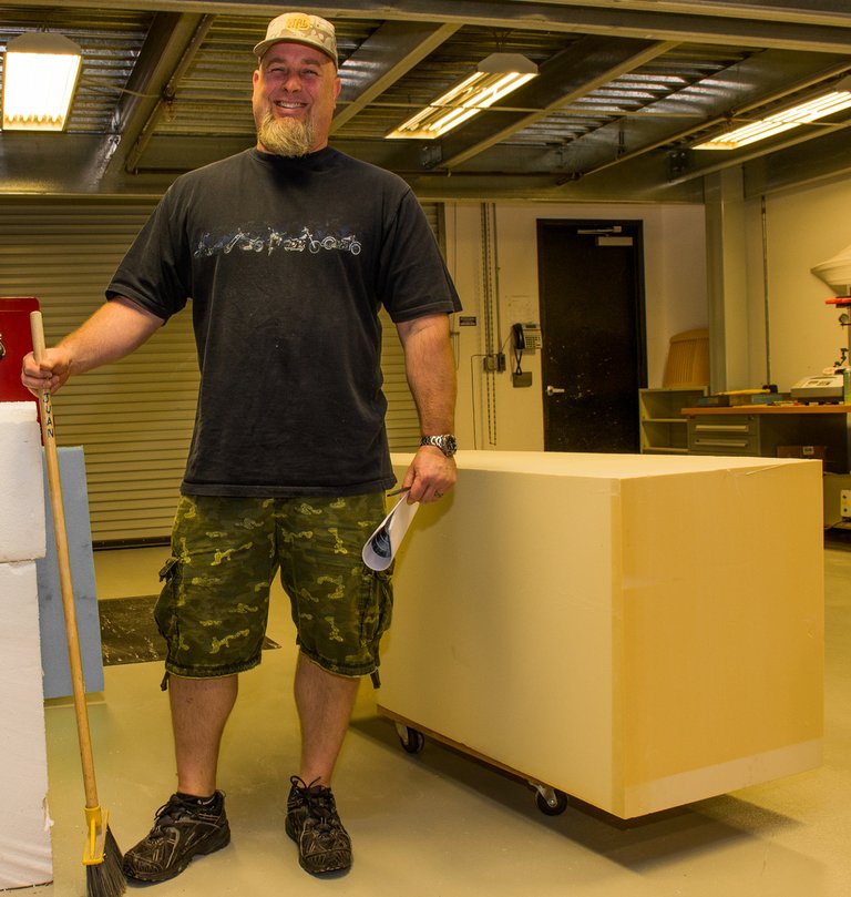 Craig mutat pár anyagot. A nagy sűrűségű rosthab annyira sűrű, hogy a 02-es BMW-t egy kézzel rámarkolva alig tudom megemelni. Hogy mennyi idő alatt készül el egy autó, a mérettől függ, egy ilyen kicsi 45 percig tart. Az életnagyságú autó, ha nem kell nagyon részletesben, már kb. 30 óra. Minden egyes plusz díszléc vagy lámpafészek kifaragása órákat jelenthet. Az életnagyságú modell nem lesz tömör: 25 milliméteres héjat faragnak, ezt már kerekekre lehet rakni, az tokkal-vonóval 2500 font körül lesz (1134 kg).