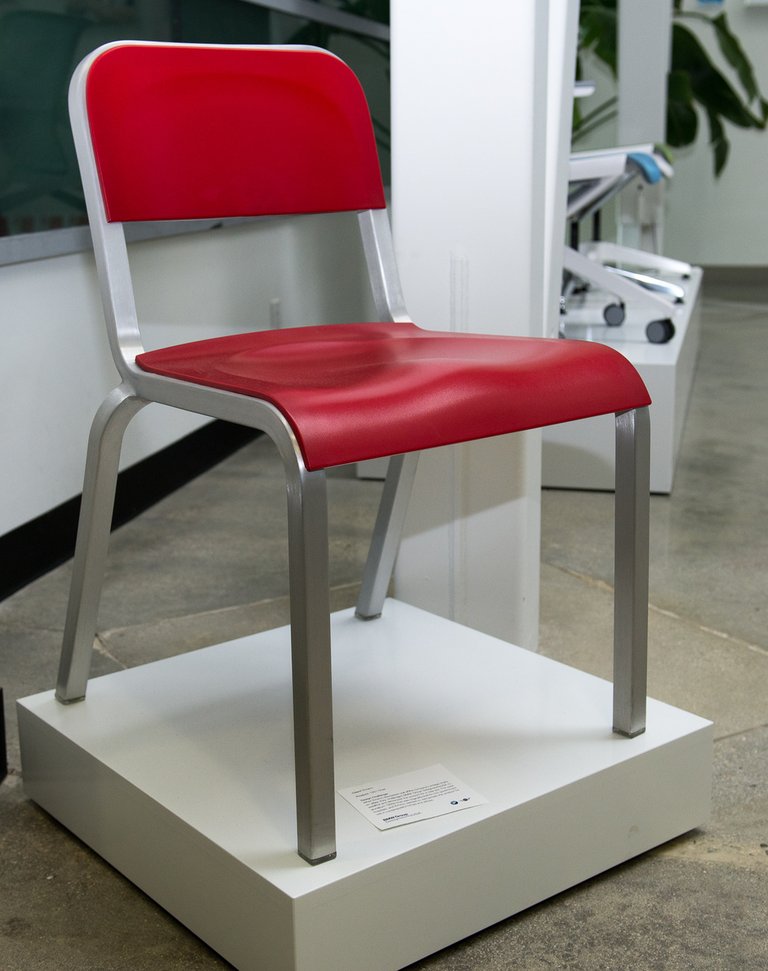 Az BMW X-sorozatot igazából Kaliforniára találták ki, lep meg közben Jackie, aki valószínűleg nem látja a nálunk futó Xdrive falu-hirdetéseket hóval, meg jégesővel. Mert tudják, hogy telik egy jobb nap Kaliforniában? „Reggel lemegyünk a partra, délután meg fel a hegyekbe.” Köszi, gondolom magamban, nektek is csak megszületni volt nehéz, Jackie pedig vezet tovább, bár rajtam kívül kevesen alélnának el az egyszerű piros szék láttán. Én viszont vérbeli tekintélytisztelő sznob vagyok, emellett Van Hooydonk-rajongó, főleg mióta hollandos közvetlenséggel nyilatkozott is nekünk, Bullshitezni a mesterrel címmel. Íme tehát: egy Adrian Van Hooydonk-szék, mondhatni egy korai Van Hooydonk. Egy fejes az Emeco székgyárnál az Ebay-en bukkant a régi, 1951-es termékükre, a széket eredetileg amerikai közintézmények használták. Ezt kellett feltörekvő formatervezőként a Designworksnél Adriannek újraálmodni: egyfelől felismerhetően megmaradjon a klasszikus jelleg, de modernebbek és dinamikusabbak legyenek a vonalak, felszínek. Van Hooydonk aztán később épp a Minin gyakorolhatta ugyanezeket a feladatokat, és mondhatni, kevés ekkora stréber van a szakmában, mert az új Mini az ipari formatervezés történetének egyik általánosan jegyzett sikere.