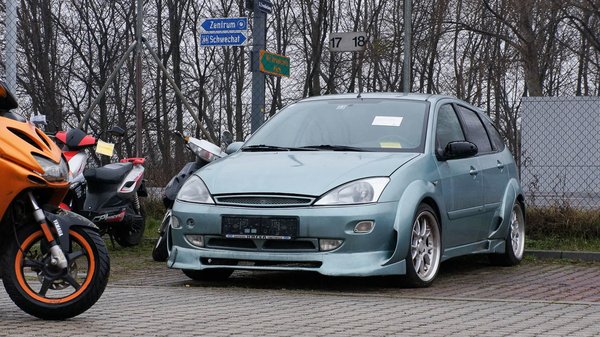A legjobban a sarokba állított tuning-Focuson szórakozunk. Gondoltam, beküldöm a Jajjdecsúnya blogra, de aztán mégsem, túl nagy kincs ez ahhoz. Centi vastagon válik le a gitt a légterelők és az intenzíven rozsdásodó kaszni közül, a Remus-vég is rügyezik már. A jobb hátsó ablakot befeszített jégkaparó és több réteg maszkolószalag tartja a helyén, a krómhatású szőnyeg és a csúcsos váltógomb fölött színre fújt belső dekorbetétek teszik tökéletessé az összhatást.