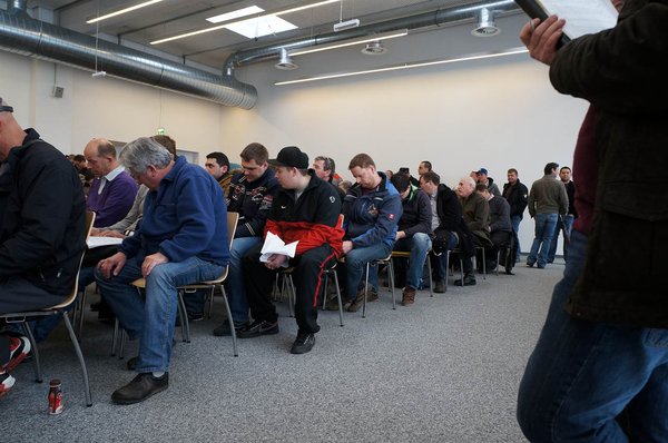 Amikor visszaérünk az árverés helyszínére, már óriási a tömeg. Egymás veséjébe könyökölnek a licitálni kívánók, hogy még időben leadhassák az ötszáz eurós kauciót, amiért cserébe sárga cetlit kapnak - ezt lehet majd feltartani a megfelelő időpontban. Mindjárt indul a műsor, a Porsche az első tétel. Helyet keresünk a teremben, a berendezése és az odabent hesszölő figurák éles kontrasztot alkotnak.