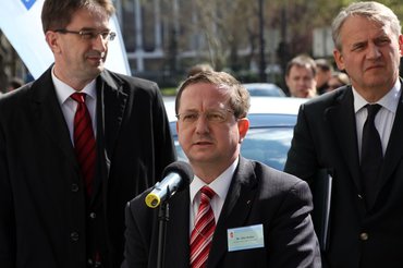 Dr. Kövesdi Zoltán, az Elmű követe kisvártatva meg is kezdi a sajttájt. A háttérben természetesen az a szolgálati Mitsubishi i-Miev, amely néhány éve kötelező szereplője a legtöbb ünnepélyes oszlopavatásnak. Újdonság, hogy már nem egyesével, hanem tízesével avatják az oszlopokat, a mostani alkalom ugyanis tíz új villanyautó-konnektornak szól, amelyekkel 34-re nőtt az összlétszám. Dr. Kövesdi kijelenti, ezzel megteremtették az elektromos autózáshoz szükséges infrastruktúrát.